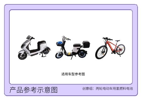 設計需求:設計一款適用于兩輪電動車用氫燃料電池及可便捷拆卸的供氫系統,燃料電池電堆尺寸130×163×129mm,氣瓶尺寸直徑135mm×高375mm。設計可以從不同車型出發,具備原創性,布局合理,可實施性,呈現內容可以是效果圖、原理圖、結構圖等。參賽作品需考慮到兩輪電動車的使用環境、氫氣使用安全性,以及該產品給用戶帶來的審美及其他可能的感官體驗。同時在保證燃料電池進出氣的同時具備一定的防水效果。