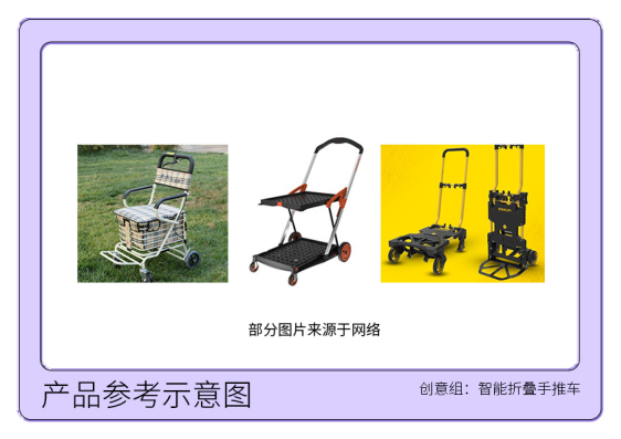 設計要求:要求設計的手推車可以折疊;可通過運用技術手段實現一定智能化功能;材料可結合各類塑料、橡膠、各類型材、金屬鑄件等,需考慮裝配和成本可控;折疊后方便家庭存放,作品需展示折疊與展開狀態;功能從用戶群體痛點出發,不作具體限制;設計需考量結構可行性,鼓勵創新型結構設計。
