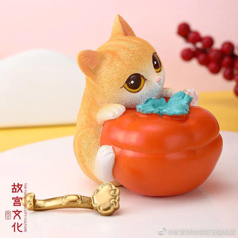 “逛”下故宮博物院吧! 每回的故宮文創 都能帶給大家許多驚喜 這不 故宮也緊跟時尚潮流 出了兩款好玩的“盲盒”! 事事如意納福貓;外盒插畫加入經典的故宮貓形象 同時摘取《弘歷歲朝圖》軸中的柿子、如意紋樣 三者有機結合 貓咪環抱朱柿的畫面 萌趣福氣!