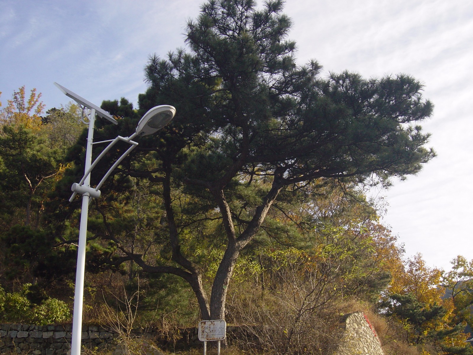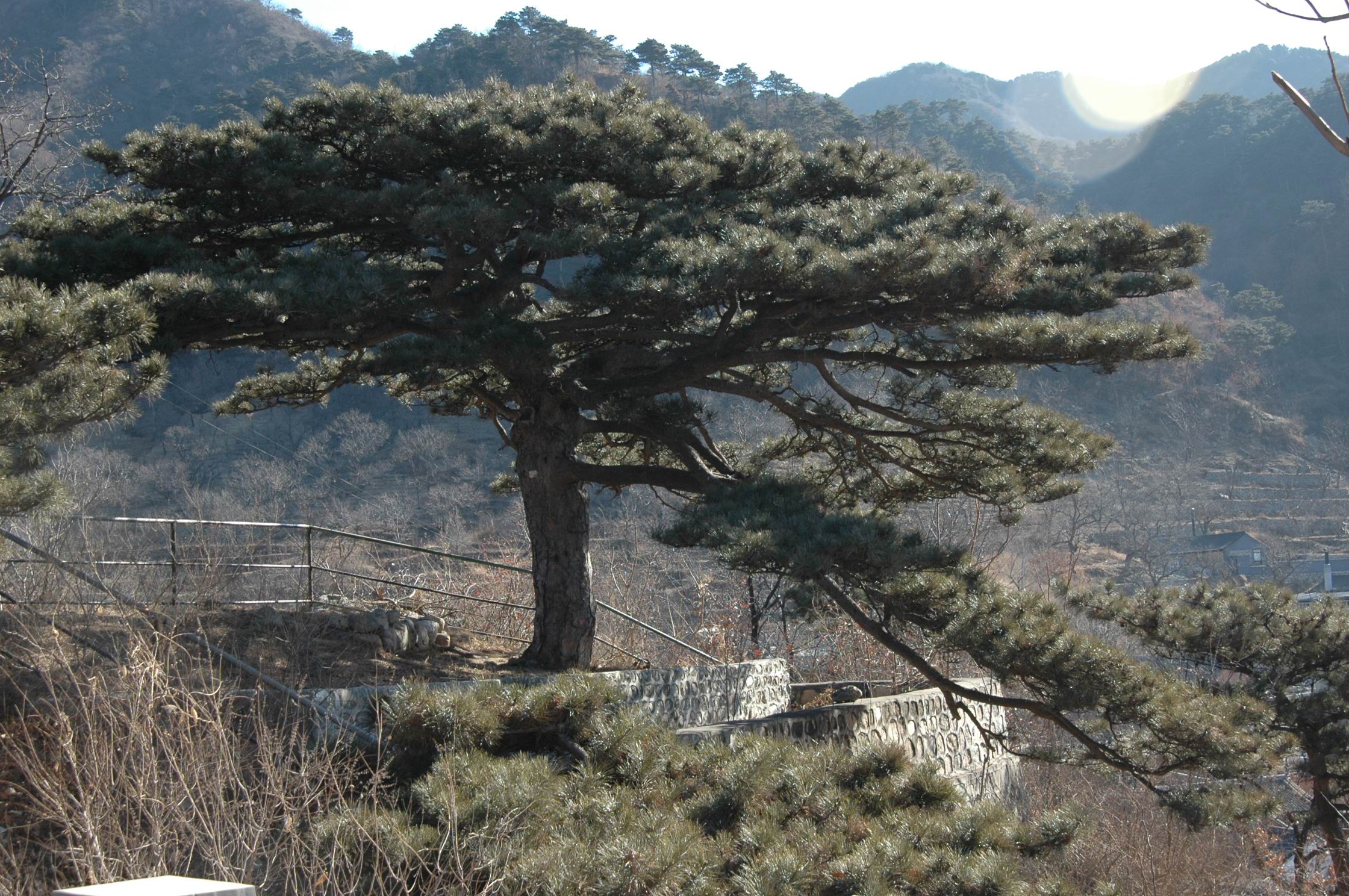 鴛鴦松,沿上行道過山澗虹橋,前行約100米,拐彎處路北側的松樹便是。此樹主干距地面約1米,分出南北各一支權。向南的支杈較粗壯挺拔,針葉長而疏,為“馬尾松”,向北的支杈彎曲,針葉短而簇,為“油松”。同一樹干長出截然不同種屬的兩個樹冠,似一對情侶相互依偎,因而被稱為“鴛鴦松”。