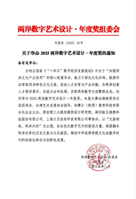 本屆大賽以“文脈相承,兩岸共織”為主題,旨在依托數字藝術的前沿力量,深度融合兩岸共享的歷史文脈與文化基因,推動中華優秀傳統文化在數字時代的創造性轉化與創新性發展。大賽積極響應國家《“十四五”數字經濟發展規劃》中關于“加強兩岸文化產業協同”的核心政策導向,致力于深化文化共鳴,鼓勵作品萃取兩岸特色文化元素,促進人才共育與產業對接,為兩岸創意人才提供展示、交流與合作機遇,共筑兩岸數字文創繁榮生態。