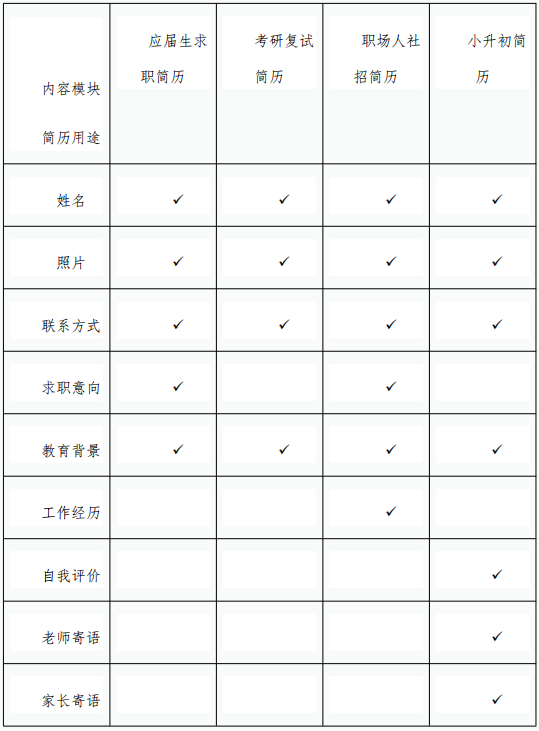 d.不同用途的簡歷必須包含的內容模塊如下表所示(畫“????????”為必須包含),未提及的內容模塊可視實際情況自行撰寫: