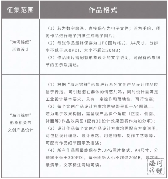 “海河錦鯉”形象設計及“海河錦鯉”形象相關的文創產品設計,需體現天津文化底蘊和天津城市形象。設計作品均以電子文件的形式提交,所有提交的作品均需在報名表內完整說明創意理念、創意用途等(若篇幅過長,可單獨附件TXT的文本文件進行說明)。所有提交的作品文件內包含設計作品及大賽統一的報名表。