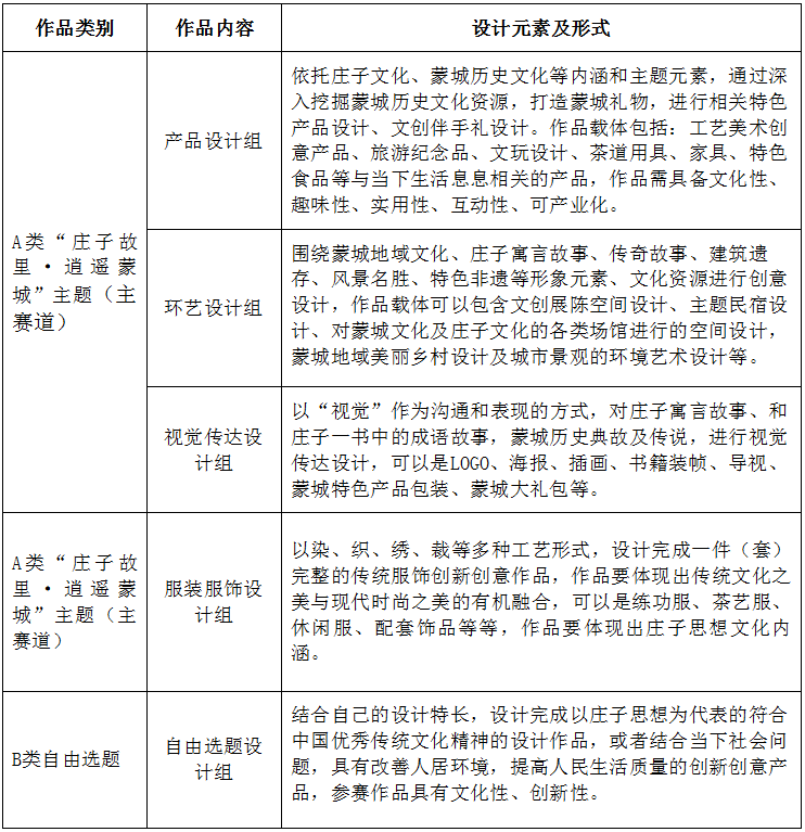 1、參賽作品須深入挖掘莊子文化及蒙城地域文化內涵,體現文化要素和背后的故事,在融合地域文化精神以及特定地方文化和產業特色的基礎上進行創作。