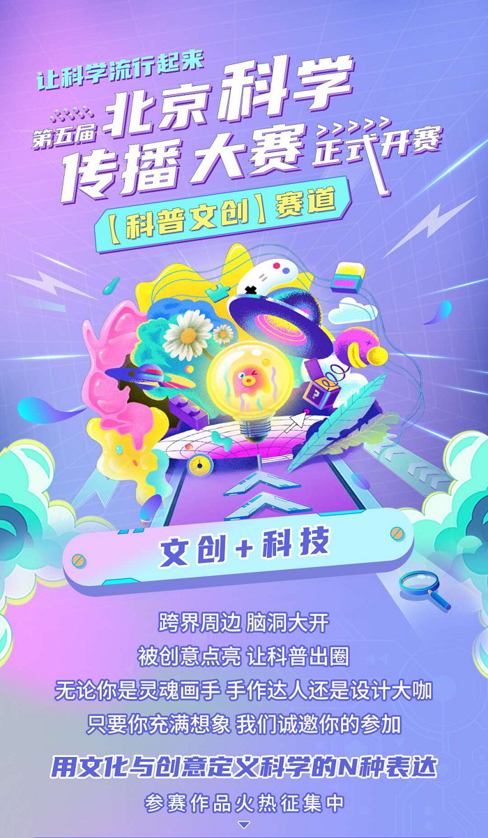 科普文創賽道為作品賽,參賽作品以科技 (科普)設施、科技成果、科普產品、科普活動等為基本素材,參賽者須設計出具有首都特色、貼近生活、內涵豐富的科普文化創意作品。